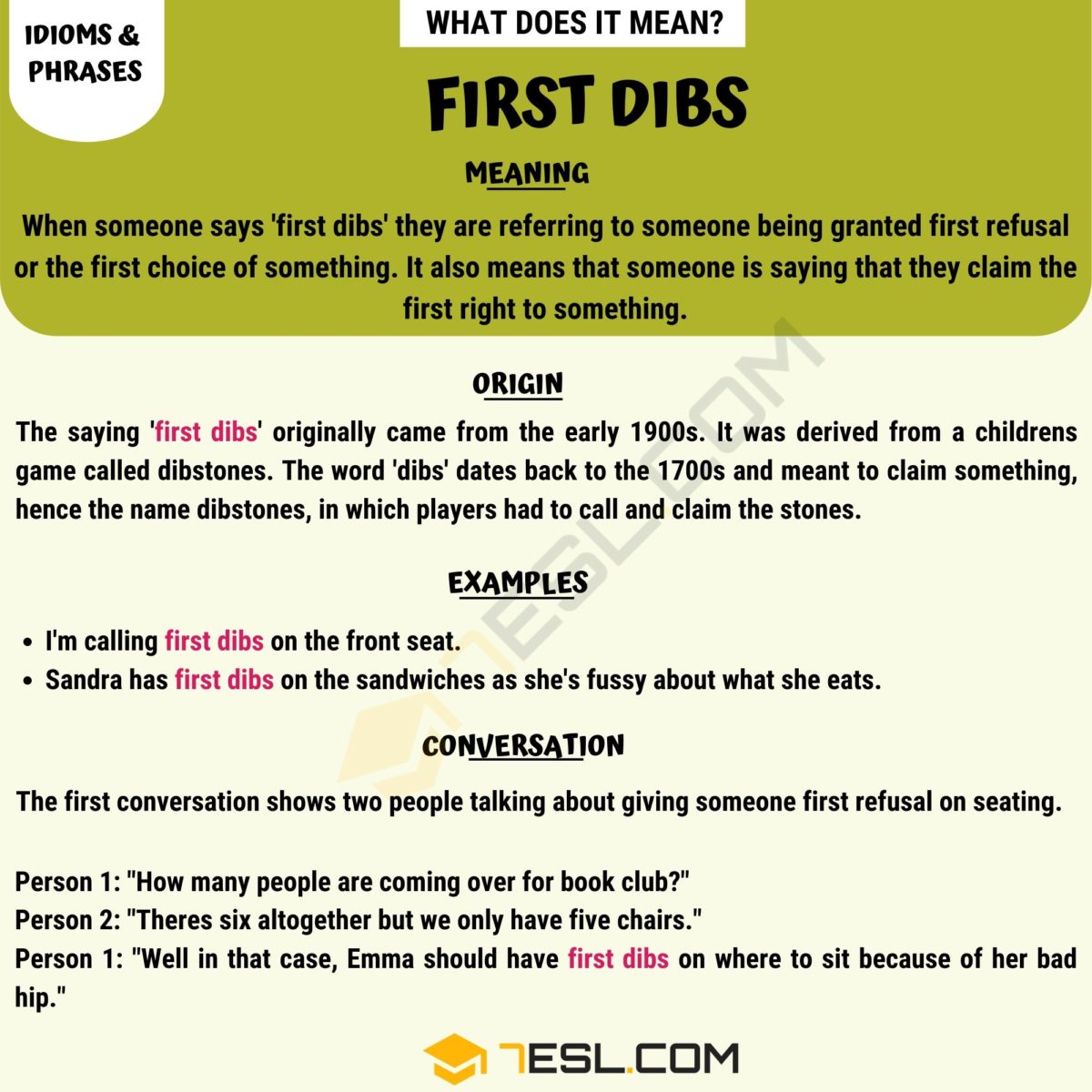 The phrase "first dibs" has its roots in American slang and is believed to have originated in the early 20th century. The term is thought to come from the game of marbles, where players would claim the first turn or pick of marbles. Over time, its usage has expanded to various contexts, signifying priority or preference in choice.